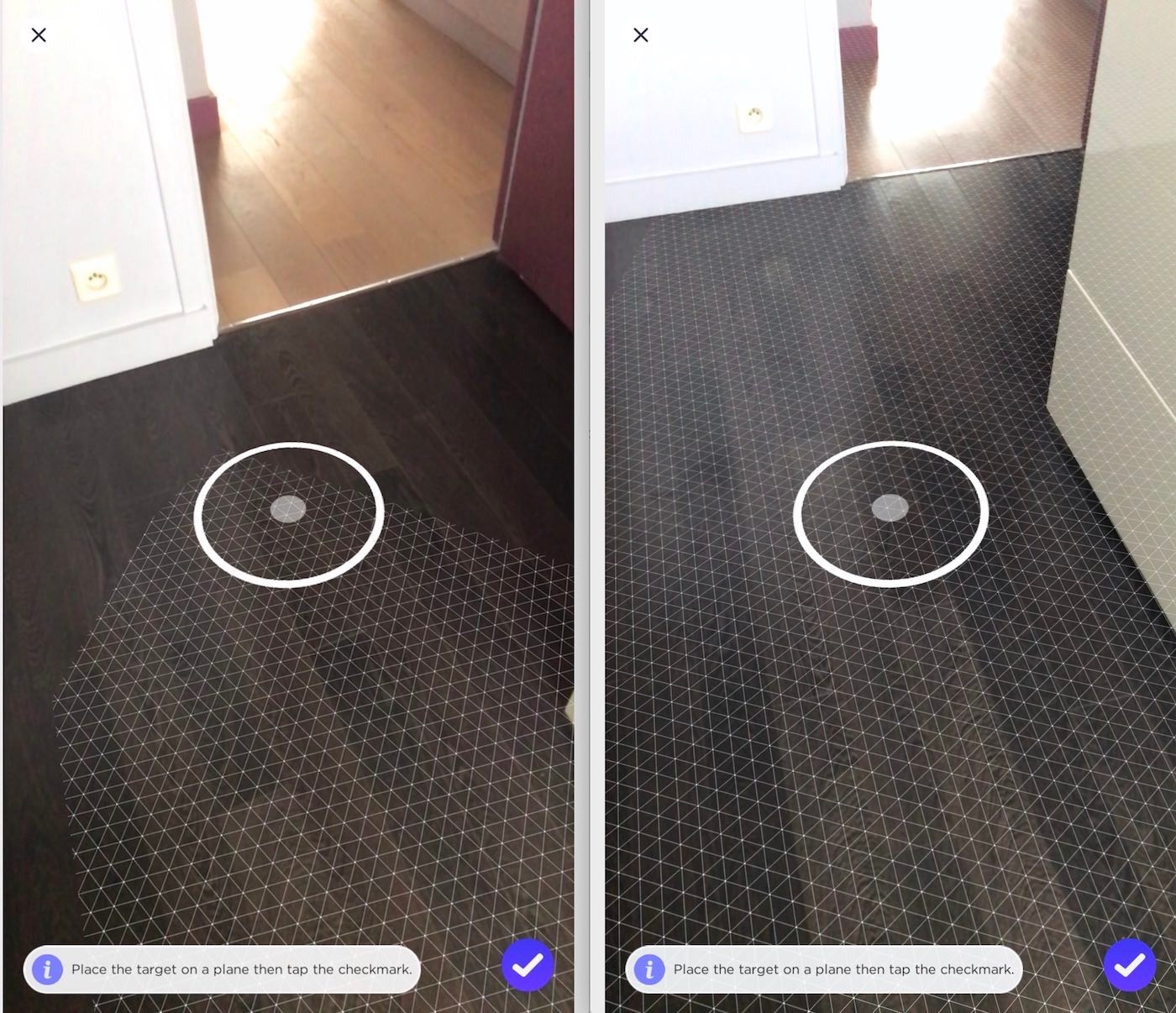 Une fois que la grille virtuelle a bien recouvert les surfaces planes autour de vous, placez le cercle blanc où vous voulez sur la grille, et tapez sur la coche bleue.